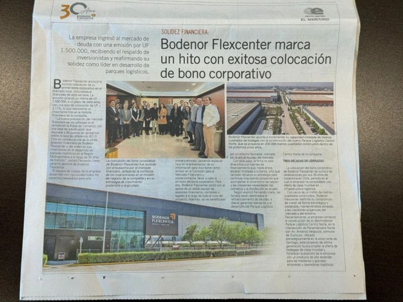 Bodenor Flexcenter marcó un hito en su historia de financiamientos al concretar exitosamente su primera emisión de bonos corporativos en el mercado local. El 3 de septiembre de 2025, la compañía colocó el bono BBODE-A por un monto de UF 1.500.000 (equivalente a más de US$ 60 millones), a un plazo de siete años y con vencimiento en 2032.